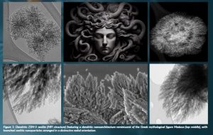 Figure 1: Dendritic ZSM-5 zeolite (MFI structure) featuring a dendritic nanoarchitecture reminiscent of the Greek mythological figure Medusa (top middle), with branched zeolitic nanoparticles arranged in a distinctive radial orientation.