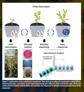 Figure 2: Explanation of the evolutionary experiment. Nine plant generations are performed in HoloE2Plant. At each generation, we perform several plant phenotyping and collection of the evolved microbes. At the end of the experimentation evolved plants and microbes are sequenced to identify common genetic bases of the interaction.
