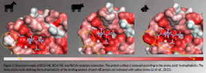 Figure 2: Structural models of ECoV HE, BCoV HE, and RbCoV:receptors interaction. The protein surface is coloured according to the amino acids’ hydrophobicity. The three amino acids defining the hydrophobicity of the binding pockets of each HE protein are indicated with yellow circles (Li et al., 2022).