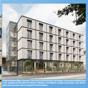 Schülerwohnheim Rehau, Germany: a five-storey school dormitory and canteen constructed completely from wood, including the lift shaft and staircase. Utilising a cost-effective modular construction, even inferior-grade wood was given value by using it for interior finishes.