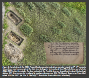 Figure 1: Aerial view of the 2024 PresentDead excavations at Achau cemetery, Austria (7th–8th centuries CE), with an inset manuscript of the Salic laws (collage by University of Graz/Michelle Sima; aerial photo: ÖAW-ÖAI/Moisés Hernández Cordero; extract of the Frankish laws on despoiling the dead, Pactus Legis Salicae, §55, in a manuscript produced in southern Germany ca. 800 CE [Munich, Bayerische Staatsbibliothek, MS Clm 4415, fol. 61v, ll. 19–24] [CC Bayerische Staatsbibliothek, München]).