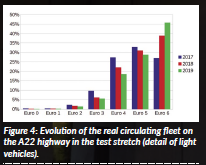 Furthermore, annual studies (Figure 4) clearly show that the renewal of the vehicles driving on the A22 motorway is happening fast in terms of EURO class, but without significant variations in terms of the share of combustion engine type. For instance, the majority of transit vehicles are diesel light vehicles, with a share that increased from 75 per cent in 2017 to 82 per cent in 2019. A remarkable increase of ‘clean’ vehicles (e.g. newer EURO-6, hybrid or full-electric passenger cars) is, however, to be expected in the coming years; this trend must also be verified in future years in order to consider also the possible effects of the COVID-19 pandemic.