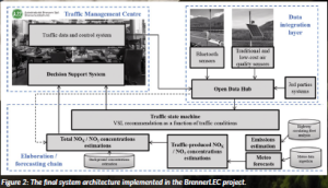 One of the main assumptions of BrennerLEC is that the activation of the measures must be proportional to the effective impact that they may generate. This means that VSLs should be activated when real-time and predicted traffic, meteorological, and air quality conditions are favourable to obtain valuable benefits. Thus, a complex ITS was implemented to let the traffic management centre (TMC) of the A22 dynamically activate the target measures (Figure 2).