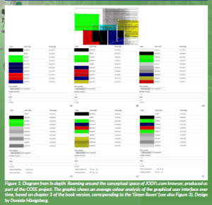 Figure 1: Diagram from In depth: Roaming around the conceptual space of JODI’s.com browser, produced as part of the COSE project. The graphic shows an average colour analysis of the graphical user interface over time, based on chapter 3 of the book version, corresponding to the ‘Green Room’ (see also Figure 3). Design by Daniela Hönigsberg.