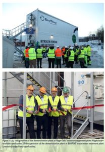 Figure 4: (A) Inauguration of the demonstration plant at Ragn-Sells’ waste management plant Högbytorp— leachate application. (B) Inauguration of the demonstration plant at BIOFOS’ wastewater treatment plant Lynetten (sludge liqour application).