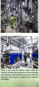 Figure 5: (A) Inside the bottom module where the reactions for both the catchment and the conversion steps take place. (B) Inside the top module where the separation for all steps is conducted with decanter centrifuges.