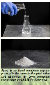 Figure 6: (A) Liquid ammonium sulphate produced in the demonstration plant within LIFE RE-Fertilize. (B) Dryed ammonium sulphate from the LIFE RE-Fertilize project.