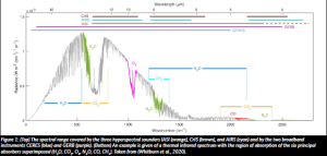 Better constraints can be obtained from spectrally resolved OLR (i.e. the integrand of broadband OLR; abbreviated SR-OLR hereafter) derived from hyperspectral sounders measuring the radiance in the thermal infrared spectral range with a higher spectral resolution. Indeed, when absorbing Earth’s radiation, the atmospheric gases leave a unique spectral signature (a sort of climate fingerprint) in the OLR (see Figure 1, bottom), which can be characterised.