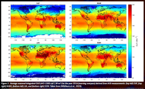 Figure 2: Average seasonal integrated OLR (645-2300 cm-1; W∙m-2) for the year 2016 (morning overpass) derived from IASI measurements: (top left) DJF, (top right) MAM, (bottom left) JJA, and (bottom right) SON. Taken from (Whitburn et al., 2020).