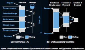 Figure 2: Inefficient function patterns: (a) synchronous I/O within a function, and (b) functions calling functions.