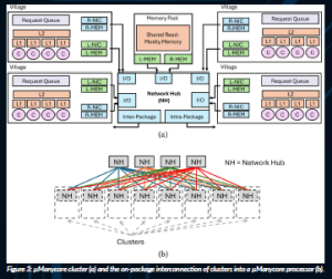 This new environment calls for a new processor design that we call µManycore (Stojkovic et al., 2023a). A µManycore has many simple cores rather than a few large cores. It does not support global hardware cache coherence. Instead, it has multiple small hardware cache-coherent domains of 4–16 cores called villages. In a village, services can communicate using shared memory, while across villages they use network messages. Groups of villages form a cluster (Figure 3a), and multiple clusters form the processor. Most importantly, the µManycore design is comprehensively optimised for tail-latency reduction. This means that, in addition to targeting inefficiencies affecting all service requests, the design allocates special hardware to smooth out contention-based overheads that may affect a subset of requests.
