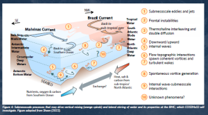 Figure 4: Submesoscale processes that may drive vertical mixing (orange spirals) and lateral stirring of water and its properties at the BMC, which COSSMoSS will investigate. Figure adapted from Sheen (2022).