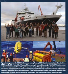 On 1 January 2025, the COSSMoSS team set sail from Montevideo, Uruguay, aboard the RRS James Cook to begin the project’s observational campaign (Figure 5). There was a shared sense of excitement, knowing many discoveries awaited. Over the next month, the ship served as both a home and a floating laboratory, allowing us to explore the dynamics of the BMC. The expedition successfully gathered high-resolution physical, chemical, geological and biological measurements. Alongside the central seismic acoustic experiment, an autonomous underwater vehicle and moored instruments collected complementary data. Argentine collaborators released 24 surface drifters to map surface currents, and marine mammals were monitored visually and acoustically to ensure minimal environmental impact. The data has unveiled a highly dynamic underwater world that we are now analysing in detail (Figure 2).