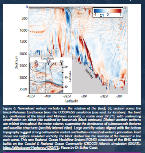 Figure 6: Normalised vertical vorticity (i.e. the rotation of the fluid), ζ/f, section across the Brazil-Malvinas Confluence from the COSSMoSS simulation (see inset for location). The front (i.e. confluence of the Brazil and Malvinas currents) is visible near 39.5°S, with contrasting stratification on either side outlined by isopycnals (black contours). Distinct vorticity patterns are evident throughout the water column, suggesting the dominance of submesoscale features and wavelike structures (possibly internal tides). Large vorticity values aligned with the bottom topography suggest strong bathymetric control and bottom-intensified vorticity generation. Inset shows sea surface simulated vorticity, the black dashed line the location of the transect in the main panel. This new Regional Ocean Modelling System (ROMS) simulation of the BMC region builds on the Coastal & Regional Ocean Community (CROCO) Atlantic simulation (GIGATL; https://github.com/Mesharou/GIGATL). Figure by Dr Esther Capó.